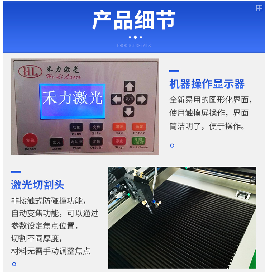 禾力激光设备的开发目标是充分发挥运动控制性能并提升激光加工效果,不论从软件设计、机械构造、电气性能到配件选材,始终强调为加工现场服务的宗旨,在全面质量管理体系的工厂环境下进行生产作业,稳定性激光切割产品,成为工业现场的新作业手段--激光加工载体。配置了自动送料的激光设备,面向纺织,服装等行业大批量加工需求的用户,大大节约了上料时间加工效率成倍提高切割效果均匀一致,使节约成本、产量的目标一切尽在掌握之中 1、 激 光 器:长度1.6米,发光功率80W-300W,聚焦后切割功率80W-300W。